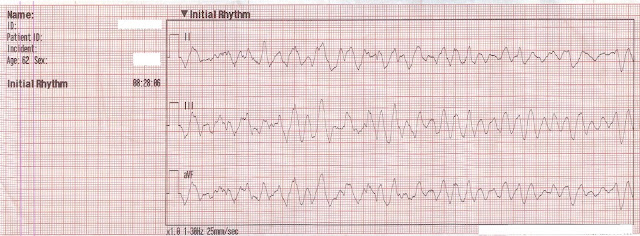 A 12-Lead ECG was obtained, showing a wide complex tachycardia with left axis deviation. It was interpreted by the paramedic as Ventricular Tachycardia.